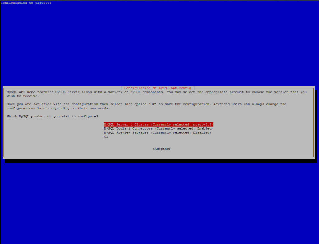 Actualizar a Mysql 5.6 o Mysql 5.7 en Debian 8 / Ubuntu ✓ muy simpleMysql / mysql upgrade 5.5, upgrade mysql 5.7, upgrade mysql debian 8, upgrade mysql to 5.6Tabla de Contentenido Descargamos un archivo .deb para que nos instale el repositorio:wget https://dev.mysql.com/get/mysql-apt-config_0.8.6-1_all.debInstalamos el repositorio y lo configuramos:dpkg -i mysql-apt-config_0.8.6-1_all.debNos va a pedir que seleccionemos la versión que queremos mediante una pantalla gráfica: Seleccionamos la primera opción, y luego seleccionamos la versión mysql que queremos, ya sea la 5.6 – 5.7 – 8 o clusters: Actualizamos repositorios y la versión 5.5 de Mysql:apt-get updateapt-get install mysql-serverVerificamos la versión Mysql:mysql --versiony obtenemos:mysql Ver 14.14 Distrib 5.6.48, for Linux (x86_64) using EditLine wrapperMás información:https://dev.mysql.com/doc Artículos relacionados:Error 1594 en Mysql SlaveGeneral error: Lock wait timeout exceededConvertir de database Antelope a Barracuda para Moodle e innodb_large_prefix ON